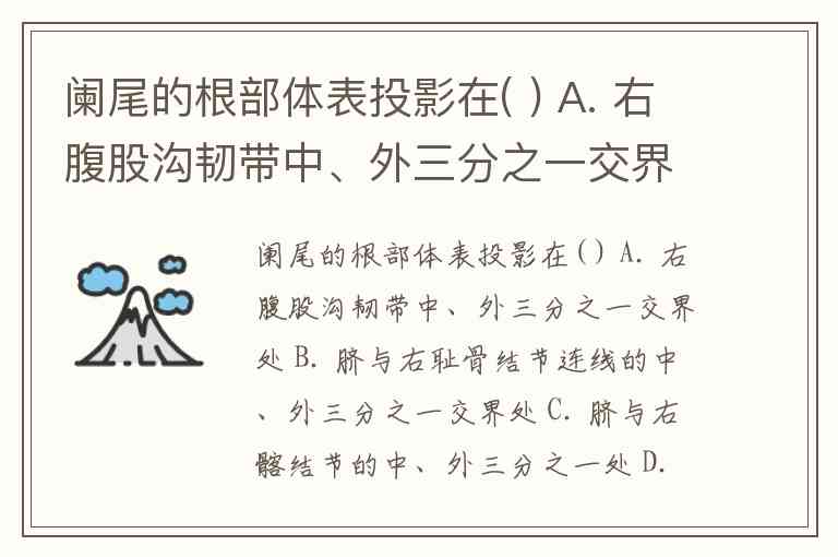 阑尾的根部体表投影在( ) A. 右腹股沟韧带中、外三分之一交界处 B. 脐与右耻骨结节连线的中、外三分之一交界处 C. 脐与右髂结节的中、外三分之一处 D. 脐与右髂前上棘连线的中、外三分之一交界处