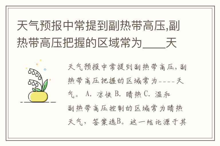 天气预报中常提到副热带高压,副热带高压把握的区域常为____天气。 A. 凉快 B. 晴热 C. 温和