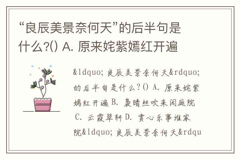 “良辰美景奈何天”的后半句是什么?() A. 原来姹紫嫣红开遍 B. 袅晴丝吹来闲庭院 C. 云霞翠轩 D. 赏心乐事谁家院