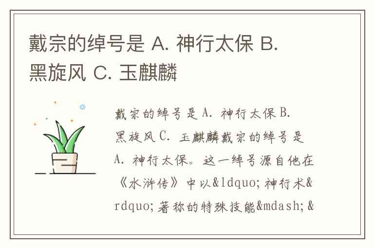 戴宗的绰号是 A. 神行太保 B. 黑旋风 C. 玉麒麟