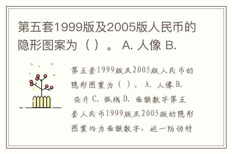 第五套1999版及2005版人民币的隐形图案为( )。 A. 人像 B. 花卉 C. 弧线 D. 面额数字
