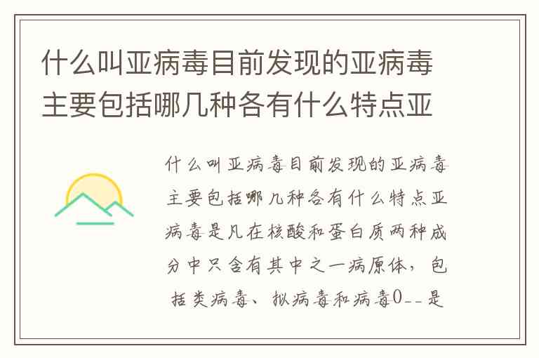 什么叫亚病毒目前发现的亚病毒主要包括哪几种各有什么特点亚病毒是凡在核酸和蛋白质两种成分中只含有其中之一病原体,包 括类病毒、拟病毒和病毒O__是一类只含有RNA一种成分,专心奇生在活细胞内的分子病 源体,核酸为裸露的环状SSRNAo摊叠是指一类包裹在真病毒粒中的有缺陷的类病毒,极其微小, 一般由裸露RNA或DNA组成,复制需依赖辅助病毒协助。沅病毒是一类不含核酸的传染性蛋白质分子,呈淀粉样颗粒状,无 免疫原性,由宿主细胞内的基因编码,抗逆性强。