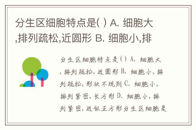 分生区细胞特点是( ) A. 细胞大,排列疏松,近圆形 B. 细胞小,排列疏松,形状不规则 C. 细胞小,排列紧密,长方形 D. 细胞小,排列紧密,近似正方形