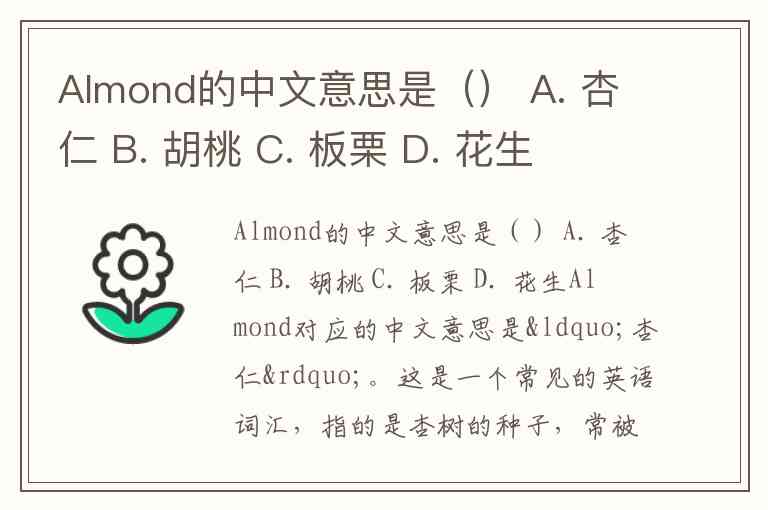 Almond的中文意思是() A. 杏仁 B. 胡桃 C. 板栗 D. 花生