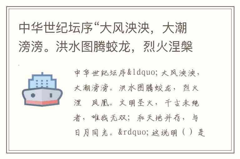 中华世纪坛序“大风泱泱,大潮滂滂。洪水图腾蛟龙,烈火涅槃凤凰。文明圣火,千古未绝者,唯我无双;和天地并存,与日月同光。”这说明()是中华文化的基本特征之一。 A. 源远流长 B. 博大精深 C. 异彩纷呈 D. 文化的包容性