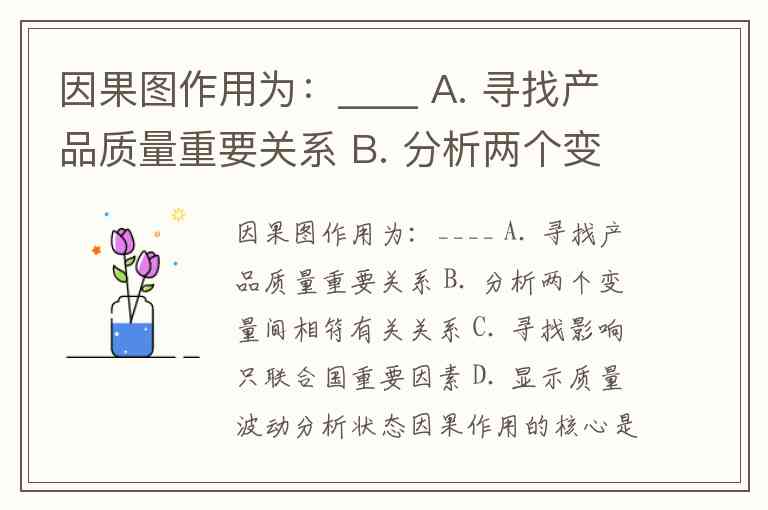 因果图作用为:____ A. 寻找产品质量重要关系 B. 分析两个变量间相符有关关系 C. 寻找影响只联合国重要因素 D. 显示质量波动分析状态