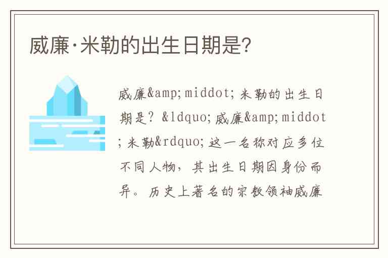 “威廉·米勒”这一名称对应多位不同人物,其出生日期因身份而异。历史上著名的宗教领袖威廉·米勒出生于1782年2月15日;美国演员比利·米勒(本名威廉·约翰·米勒)的生卒日期为1979年9月17日至2023年9月15日;另有一位同名演员的出生日期为1978年9月9日;英国演员威廉·弗兰克林-米勒出生于2004年3月25日;还有一位1996年6月8日出生的威廉·米勒见于公开记录。若需准确信息,建议补充人物的职业、国籍等背景细节。你想了解的是哪位威廉·米勒呢?