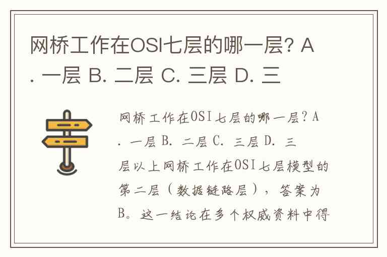 网桥工作在OSI七层模型的第二层(数据链路层),答案为B。这一结论在多个权威资料中得到一致确认,包括明确指出网桥属于数据链路层设备的技术文档,以及将其与交换机并列归类为第二层设备的网络模型解析。