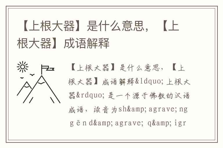 “上根大器”是一个源于佛教的汉语成语,读音为shàng gēn dà qì,原指具备上等“根器”的修行者,后泛指天资、才能极高的人。佛教以“根”比喻人先天的资质或悟性,以“器”象征可塑之才,认为“上根”者经雕琢易成“大器”,就像优质木材更易被雕刻成精美器物。这种人往往能“一念直超”,快速领悟深层道理,如六祖惠能以“本来无一物”的顿悟境界,展现了上等根器者对“空”的透彻理解。