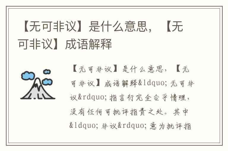 “无可非议”指言行完全合乎情理,没有任何可批评指责之处。其中“非议”意为批评指责,整个成语强调对事物的完全肯定评价。这种评价适用于符合道德、法律或常规标准的人、事、思想等多个方面,比如科学家经过严格验证的研究成果,或员工因能力出众获得的晋升。