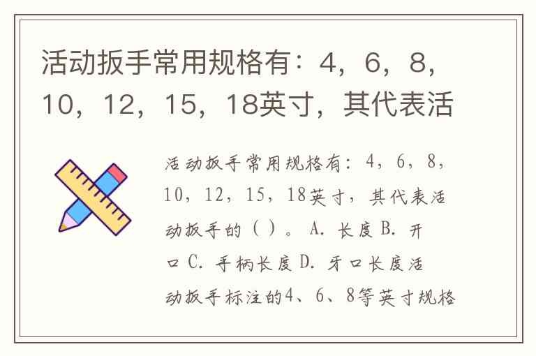 活动扳手常用规格有:4,6,8,10,12,15,18英寸,其代表活动扳手的()。 A. 长度 B. 开口 C. 手柄长度 D. 牙口长度