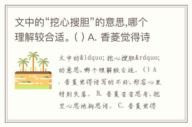 文中的“挖心搜胆”的意思,哪个理解较合适。( ) A. 香菱觉得诗写的不好,形容心里特别失落。 B. 香菱苦苦思考,挖空心思地构思诗。 C. 香菱觉得诗写的不好,形容心里特别痛苦。 D. 香菱费尽心思思考诗,注意力特别专注。