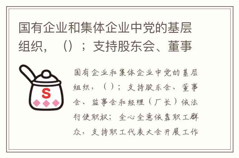 国有企业和集体企业中党的基层组织,();支持股东会、董事会、监事会和经理(厂长)依法行使职权;全心全意依靠职工群众,支持职工代表大会开展工作;参与企业重大问题的决策;加强党组织的自身建设,领导思想政治工作、精神文明建设和工会、共青团等群众组织。 A. 发挥政治核心作用 B. 围绕企业生产经营开展工作 C. 保证监督党和国家的方针、政策在本企业的贯彻执行 D. 落实党风廉政建设责任制