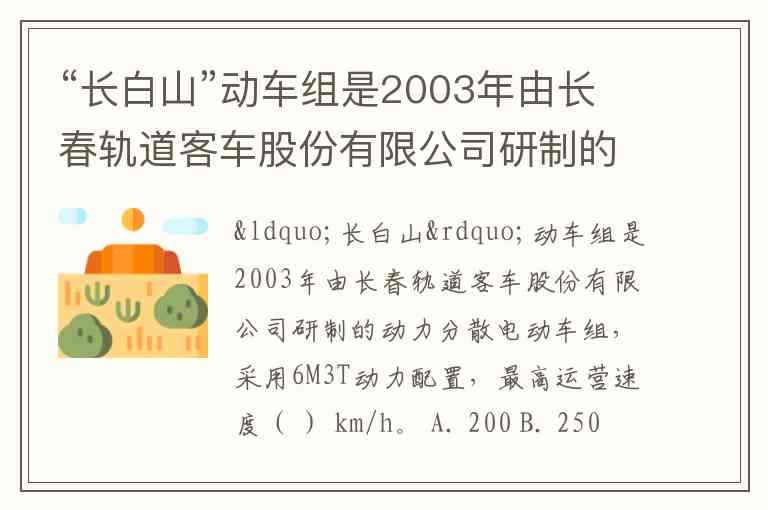 “长白山”动车组是2003年由长春轨道客车股份有限公司研制的动力分散电动车组,采用6M3T动力配置,最高运营速度( ) km/h。 A. 200 B. 250 C. 300 D. 350