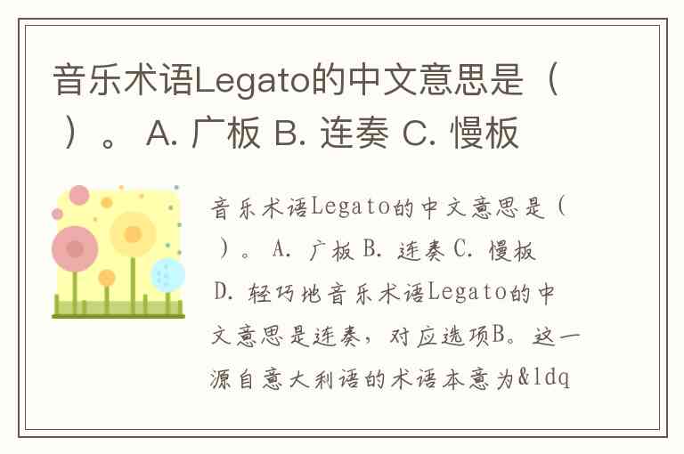 音乐术语Legato的中文意思是( )。 A. 广板 B. 连奏 C. 慢板 D. 轻巧地