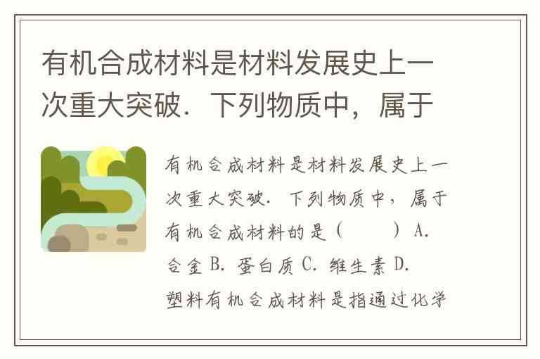 有机合成材料是材料发展史上一次重大突破.下列物质中,属于有机合成材料的是( ) A. 合金 B. 蛋白质 C. 维生素 D. 塑料