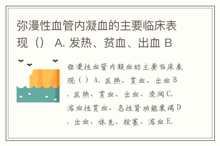 弥漫性血管内凝血的主要临床表现() A. 发热、贫血、出血 B. 发热、贫血、出血、浸润 C. 溶血性贫血、急性肾功能衰竭 D. 出血、休克、栓塞、溶血 E. 发热、皮疹、肝脾淋巴结肿大、骨质缺损、突眼、尿崩