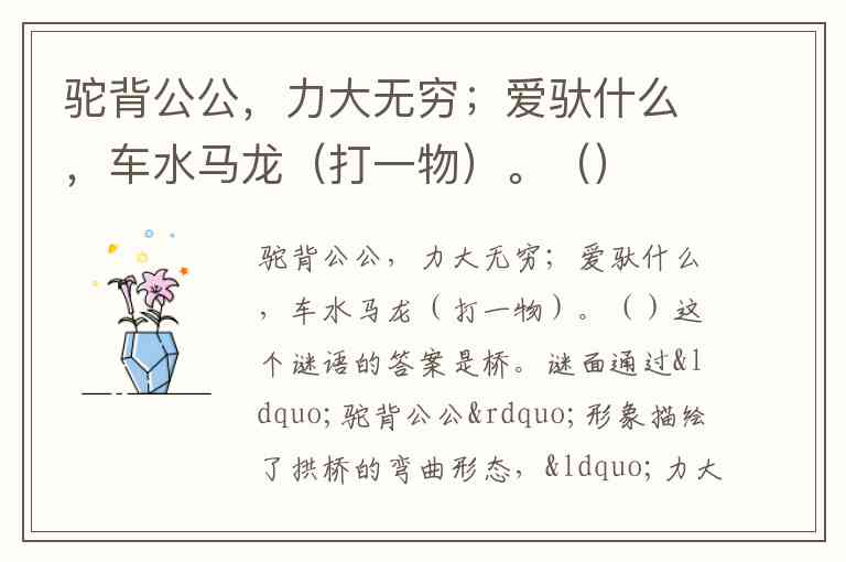 这个谜语的答案是桥。谜面通过“驼背公公”形象描绘了拱桥的弯曲形态,“力大无穷”和“车水马龙”则点出了它承载行人车辆的功能。桥梁作为连接两岸的交通设施,其拱形结构既像佝偻的脊背,又能支撑巨大重量,完美契合了谜语的描述。从古代的石拱桥到现代的斜拉桥,桥梁始终以“驼背”之姿承载着“车水马龙”的繁忙交通,成为人类文明中兼具实用与美感的工程奇迹。你还能想到哪些用拟人手法描绘日常事物的经典谜语呢?