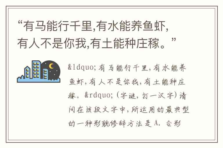 “有马能行千里,有水能养鱼虾,有人不是你我,有土能种庄稼。”(字谜,打一汉字)请问在该段文字中,所运用的最典型的一种形貌修辞方法是 A. 合形 B. 增笔 C. 排比 D. 减笔