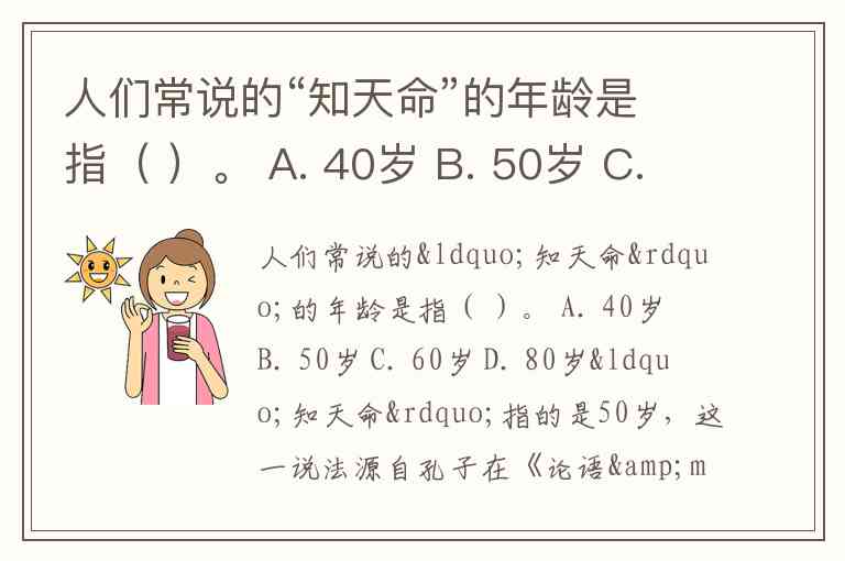 人们常说的“知天命”的年龄是指( )。 A. 40岁 B. 50岁 C. 60岁 D. 80岁