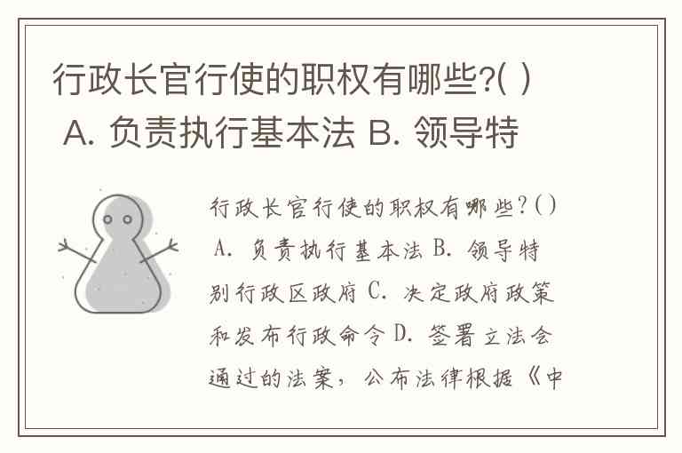 行政长官行使的职权有哪些?( ) A. 负责执行基本法 B. 领导特别行政区政府 C. 决定政府政策和发布行政命令 D. 签署立法会通过的法案,公布法律