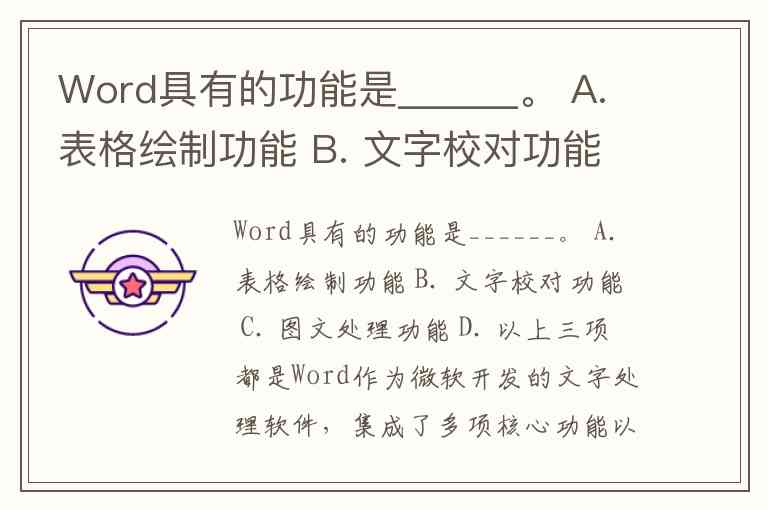 Word具有的功能是______。 A. 表格绘制功能 B. 文字校对功能 C. 图文处理功能 D. 以上三项都是