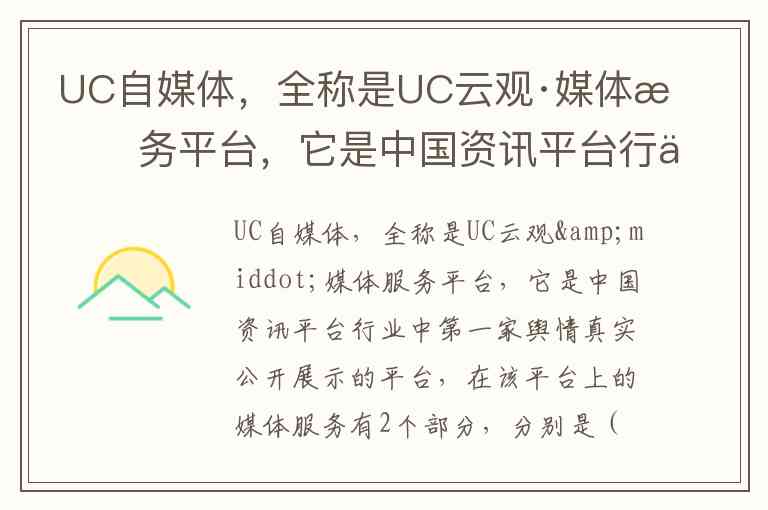UC自媒体,全称是UC云观·媒体服务平台,它是中国资讯平台行业中第一家舆情真实公开展示的平台,在该平台上的媒体服务有2个部分,分别是( )、机构媒体。 A. 公众号 B. 订阅号 C. 企业号 D. 达人号