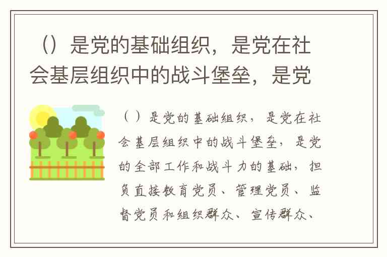 ()是党的基础组织,是党在社会基层组织中的战斗堡垒,是党的全部工作和战斗力的基础,担负直接教育党员、管理党员、监督党员和组织群众、宣传群众、凝聚群众、服务群众的职责。 A. 党支部 B. 党小组 C. 党员大会 D. 党群部门