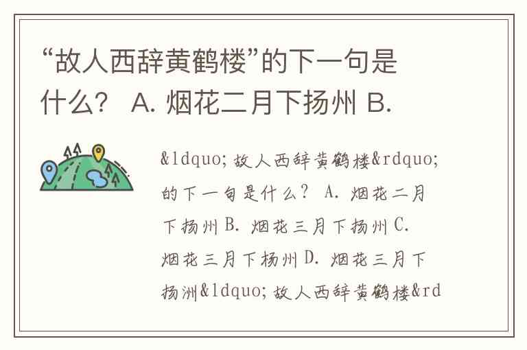 “故人西辞黄鹤楼”的下一句是什么? A. 烟花二月下扬州 B. 烟花三月下扬州 C. 烟花三月下杨州 D. 烟花三月下扬洲