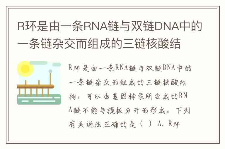 R环是由一条RNA链与双链DNA中的一条链杂交而组成的三链核酸结构,可以由基因转录所合成的RNA链不能与模板分开而形成。下列有关说法正确的是( ) A. R环的产生对基因突变不可能存在阻碍作用 B. R环中未配对的DNA单链可以进行转录 C. 杂合链中A-U/T碱基对的比例不影响R环的稳定性 D. RNA链未被快速转运到细胞质中可导致R环形成