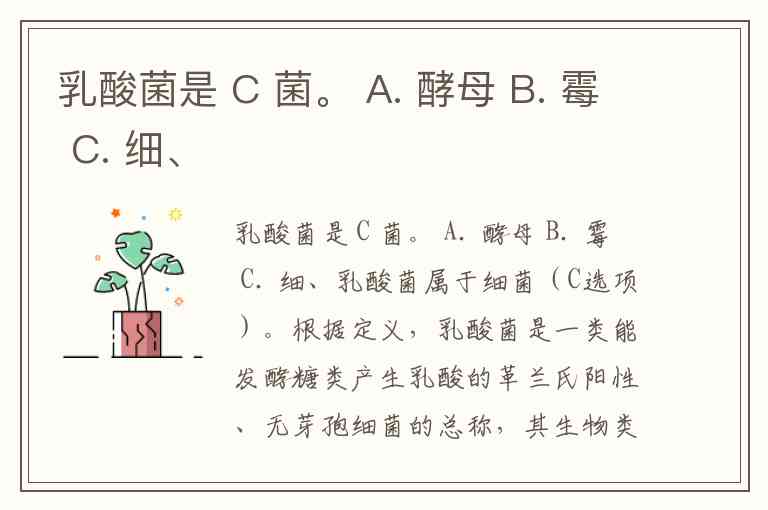 乳酸菌是 C 菌。 A. 酵母 B. 霉 C. 细、