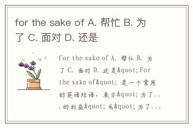 "For the sake of" 是一个常用的英语短语,表示"为了...的利益"或"为了...起见",需要选择意思最接近的中文表达。选项中"为了"(B)直接对应这一含义,而"帮忙"(A)侧重协助行为,"面对"(C)强调遭遇情况,"还是"(D)表示选择或让步,均不符合原意。