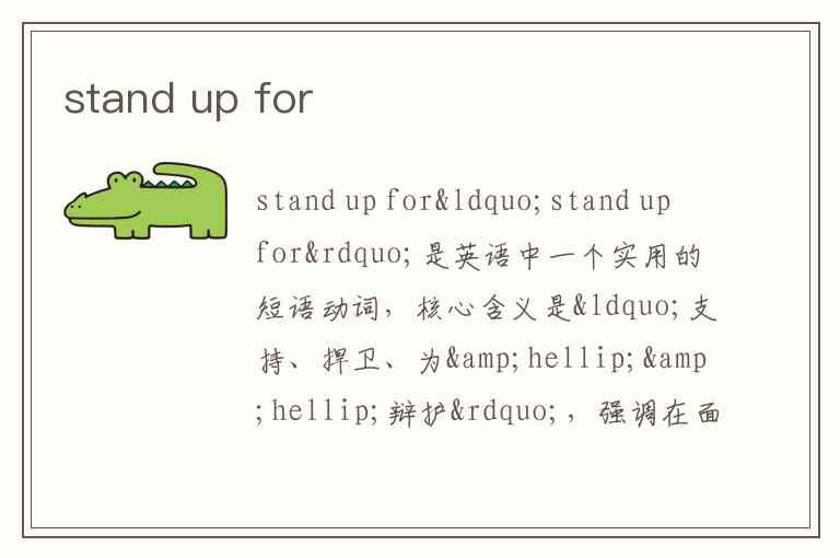 “stand up for”是英语中一个实用的短语动词,核心含义是“支持、捍卫、为……辩护”,强调在面对不公或挑战时主动维护某人、某事或某种立场。它由动词“stand up”和介词“for”构成,后接名词或代词,不能直接跟动词原形。