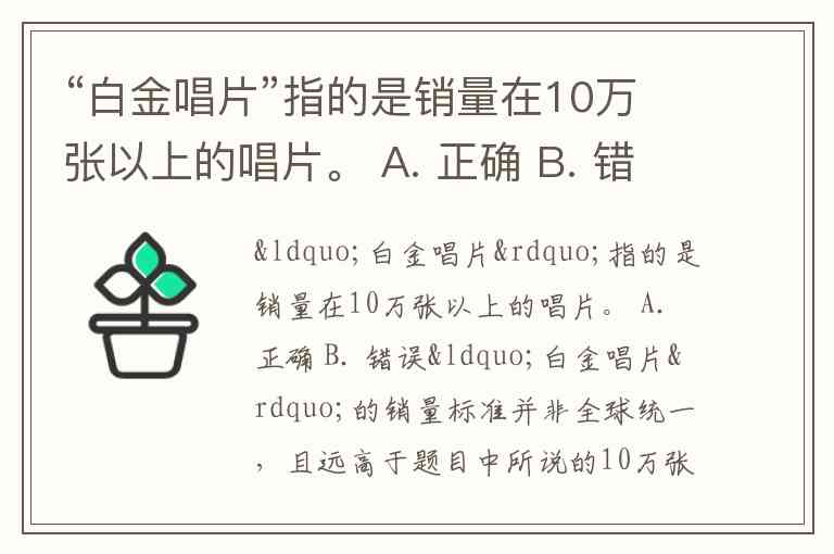 “白金唱片”指的是销量在10万张以上的唱片。 A. 正确 B. 错误