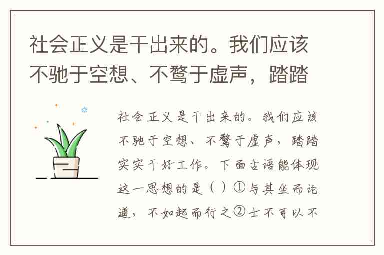 社会正义是干出来的。我们应该不驰于空想、不鹜于虚声,踏踏实实干好工作。下面古语能体现这一思想的是()①与其坐而论道,不如起而行之②士不可以不弘毅,任重而道远③道虽迩,不行不至;事虽小,不为不成④临渊羡鱼,不如退而结网 A. ①②③④ B. ①②③ C. ②③④ D. ①③④