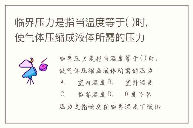 临界压力是指当温度等于( )时,使气体压缩成液体所需的压力。 A. 、室内温度 B. 、室外温度 C. 、临界温度 D. 、0 度