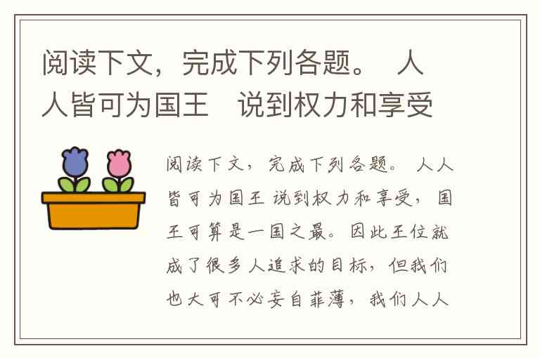 阅读下文,完成下列各题。 人人皆可为国王 说到权力和享受,国王可算是一国之最。因此王位就成了很多人追求的目标,但我们也大可不必妄自菲薄,我们人人都可以成为自己的国王。 虽然大有大的好处,但它却不能占据全部的风光。比如,同是长度位,以“里”去量路程可以,去量房屋之大小则不成;以“尺”去量房屋大小可以,去量一本书甚至一张纸的厚薄则难为它了。同是观察工具,望远镜可以观数里、数十里之外,看微生物则不行,能挥洒自如的是显微镜。以人而论,权大位显,如王如皇亦有他的局限。比如他就不能享受村夫之乐、平民之趣。《红楼梦》里凤姐说得好,“大有大的难处”。据说现在的荷兰女王也很为继承人发愁,因为她的三个子女因担心失去生活之趣对王位都不感兴趣。 在现代社会里,每一个成功者都可以在自己的王国里成为国王,享受高呼的崇敬,享受鲜花和红地毯。你看歌星、球星是追星族的国王;作家、画家是欣赏者的国王;学者、教授是他学术领域的国王;幼儿园的阿姨、小学校的教师整天享受着孩子们的拥戴,也俨然如王--孩子王。就是牧羊人,在蓝天白云下长鞭一甩,引吭高歌,也有天地间唯我独尊的国王感。 当一个人壮志难酬或怀才不遇时,他仍然可以为王。塞翁失马,焉知非福;失之东隅,收之桑榆。北宋时的柳永,宋仁宗不喜欢他,几次考试不第连个做臣子的资格也拿不到,他只好去当“民”。“凡有井水处都有柳词”。因而他在词坛成为了自己的国王--词王。林则徐被清政府贬到伊犁,沿途官民却争相拜迎,泪洒长亭,赠衣赠食争睹尊容。到住地后人们又去慰问,去求字。以至于待写的宣纸堆积如山。在人格王国里林则徐被推举为王。 在日常生活中更是人人可以为王。我看过一场演唱会,那歌手也没有什么名,但当时着实有王者风范,台下的女孩子毫不羞涩地高喊“我爱你”,演唱结束,要跟他拥抱。 国王的精神享受有三:一是有成就感;二是有自由度;三是有追随者。只要做到这三点,不管你是白金汉宫里的英国女王,还是拉着小提琴的街头艺术家,在精神上都能得到同样的满足。要做到这一点并不难,只要诚实、勤奋就行--因为你虽没有王业之成,大小总有事业之成;虽没有权的自由,但有身心的自由;虽没有臣民追随,但一定有朋友、有人缘,也可能还有崇拜者。所以人人皆可为国王,谁也不用自卑,谁也不要骄傲。 (1)文章的中心论点是什么? (2)文章第②段运用的论证方法主要是什么?作用是什么? (3)文章第③段到第⑤段分别是从哪些方面来论述文章观点的? (4)请在第④段结尾处列举一个事例来补充论述。 (5)你认为本文的观点对生活中的哪些人会有非常大的触动?