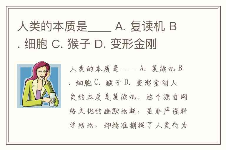 人类的本质是____ A. 复读机 B. 细胞 C. 猴子 D. 变形金刚