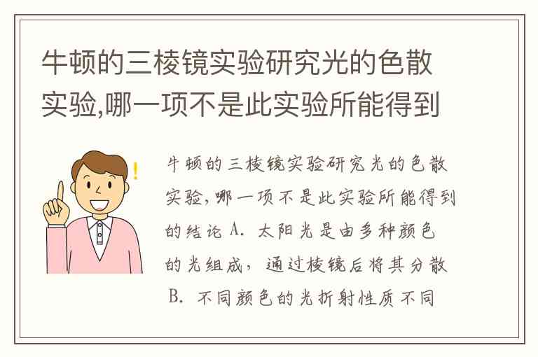 牛顿的三棱镜实验研究光的色散实验,哪一项不是此实验所能得到的结论 A. 太阳光是由多种颜色的光组成,通过棱镜后将其分散 B. 不同颜色的光折射性质不同 C. 最容易折射的光是红光 D. 太阳光通过水滴折射发生的色散形成彩虹,跟这个实验具有相同的物理原理