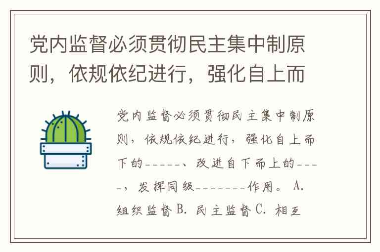 党内监督必须贯彻民主集中制原则,依规依纪进行,强化自上而下的_____、改进自下而上的____,发挥同级_______作用。 A. 组织监督 B. 民主监督 C. 相互监督 D. 有效监督