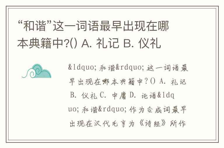 题目选项中,《礼记》《仪礼》《中庸》《论语》均为先秦至汉初典籍,但今本原文均未发现“和谐”二字连用。需注意的是,部分文献误认为《管子·兵法》出现“和谐”,实则其原文为“和合故而能谐”,仍为单字使用。因此严格来说,若限定选项范围,本题无完全准确答案;若依据汉代最早的典籍注释,则《诗经》毛传为“和谐”一词的最早出处,而《诗经》作为经文本身并不包含该词。这一现象反映了汉语词汇从单音词向复合词演变的过程——先秦时期“和”“谐”独立使用,汉代以后逐渐形成“和谐”这一并列式合成词。