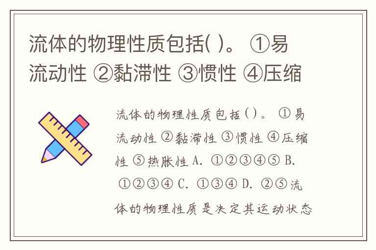 流体的物理性质是决定其运动状态的核心因素,题目中列出的①易流动性、②黏滞性、③惯性、④压缩性、⑤热胀性均属于流体的基本物理性质。以下是具体分析: