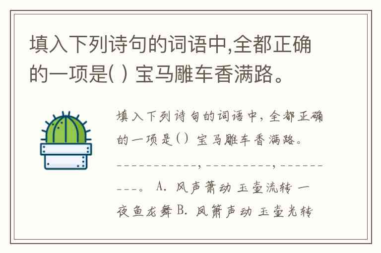 填入下列诗句的词语中,全都正确的一项是( ) 宝马雕车香满路。___________,_________,_________。 A. 风声萧动 玉壶流转 一夜鱼龙舞 B. 凤箫声动 玉壶光转 一夜鱼龙舞 C. 风声萧动 玉壶夜转 一夜鱼龙舞 D. 凤箫声动 玉壶光转 一夜鱼龙转