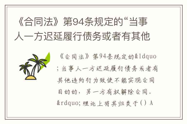《合同法》第94条规定的“当事人一方迟延履行债务或者有其他违约行为致使不能实现合同目的的,另一方有权解除合同。”理论上将其归类于( ) A. 协议解除 B. 约定解除 C. 法定解除 D. 意定解除