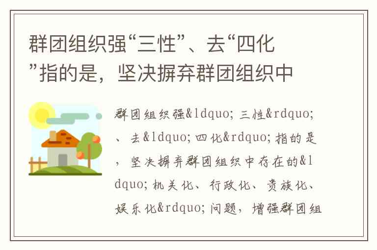群团组织强“三性”、去“四化”指的是,坚决摒弃群团组织中存在的“机关化、行政化、贵族化、娱乐化”问题,增强群团组织的“____”。() A. 系统性 B. 政治性 C. 先进性 D. 群众性