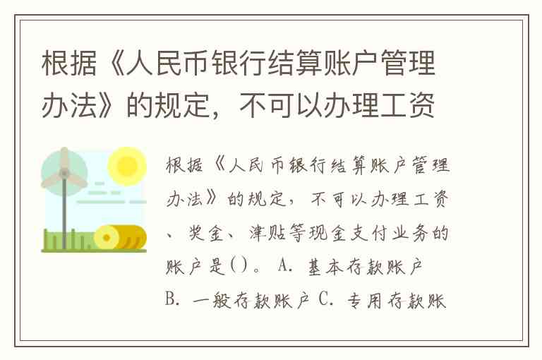 根据《人民币银行结算账户管理办法》的规定,不可以办理工资、奖金、津贴等现金支付业务的账户是( )。 A. 基本存款账户 B. 一般存款账户 C. 专用存款账户 D. 临时存款账户