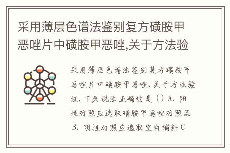 采用薄层色谱法鉴别复方磺胺甲恶唑片中磺胺甲恶唑,关于方法验证,下列说法正确的是 ( ) A. 阳性对照应选取磺胺甲恶唑对照品 B. 阴性对照应选取空白辅料 C. 阴性对照、阳性对照与供试品应采用相同处理方式,在同一薄层板上点样、展开、显色 D. 阳性对照斑点的位置处,阴性对照应没有斑点,表明方法专属性良好