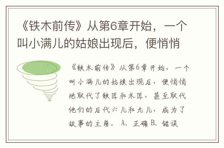 《铁木前传》从第6章开始,一个叫小满儿的姑娘出现后,便悄悄地取代了铁匠和木匠,甚至取代他们的后代六儿和九儿,成为了故事的主角。 A. 正确 B. 错误