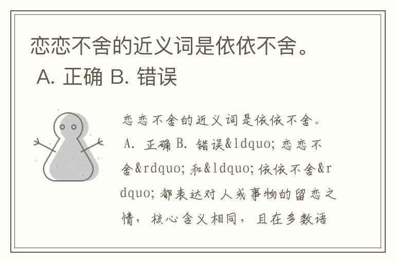 “恋恋不舍”和“依依不舍”都表达对人或事物的留恋之情,核心含义相同,且在多数语境中可互换使用,因此它们是标准的近义词。答案是A.正确。