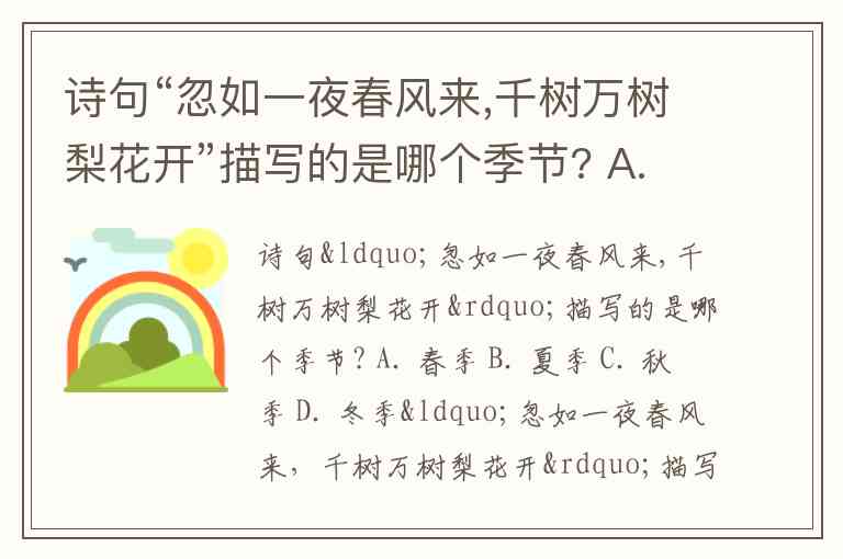 诗句“忽如一夜春风来,千树万树梨花开”描写的是哪个季节? A. 春季 B. 夏季 C. 秋季 D. 冬季